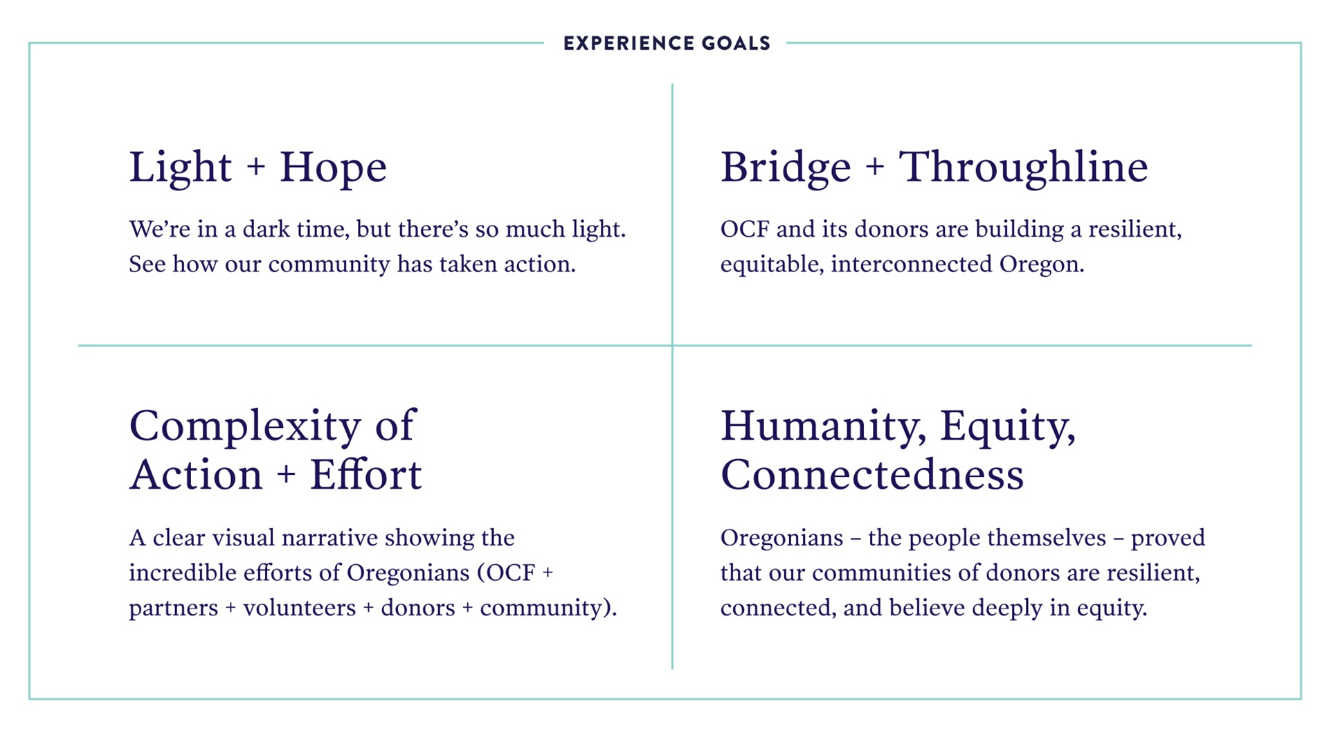 For the report design, we worked closely with OCF’s communication and program teams to develop the overarching story and explore ideas for how this report could stand out as a call to action to continue the work of supporting Oregonians. At this stage, our job is to help the client articulate key communication goals that could be the foundations of a visual narrative. OCF wanted the annual report to focus on the donors and the communities they serve, not on themselves. They wanted to clearly acknowledge the pain so many experienced, but also of the bright light of the generous actions of so many.